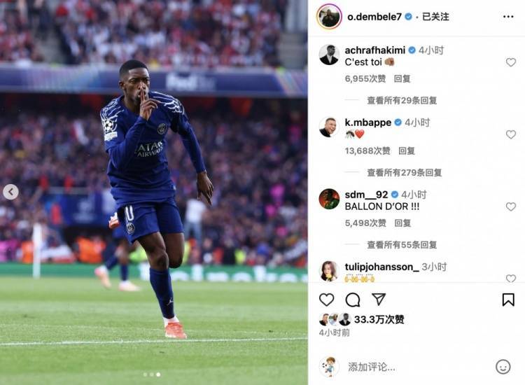 开场闪击!登贝莱社媒晒进球庆祝照,姆巴佩点赞:🦟️ admin 2025年04月30日 12:30 133 0 直播吧4月30日讯 欧冠半决赛首回合,巴黎圣日耳曼客场1比0击败阿森纳。登贝莱开场第4分钟为巴黎首开记录。赛后,登贝莱更新社交媒体并晒出自己的进球庆祝照。前巴黎队友姆巴佩第一时间为其送上点赞:🦟❤️值得一提的是,蚊子正是登贝莱的外号:形容他身材细瘦、四肢纤长,与蚊子的形态特征高度吻合。还有他的速度优势,登贝莱在球场上的快速突破难以防守,如同蚊子般难以捕捉。 标签: #圣日耳曼 #登贝莱 #决赛 #客场 #欧冠 #阿森纳 #上点 #蚊子 #姆巴佩 #进球 #巴黎 #登贝莱社
