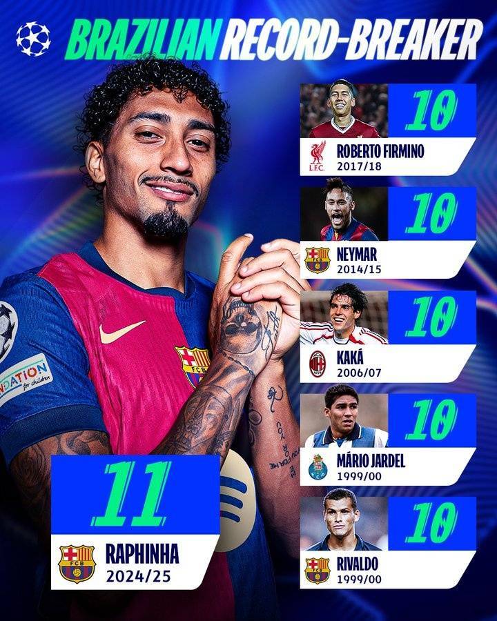 拉菲尼亚欧冠打进11球,成为单赛季欧冠进球最多的巴西球员 admin 2025年03月15日 02:30 144 0 直播吧3月14日讯 欧冠官方今日晒出海报,拉菲尼亚打破巴西球员单赛季欧冠进球纪录。本赛季,拉菲尼亚欧冠已经打入了11球,成为单赛季欧冠进球最多的巴西球员,超过菲尔米诺(17-18赛季10球)、内马尔(14-15赛季10球)、卡卡(06-07赛季10球)、贾德尔(90-00赛季10球)和里瓦尔多(99-00赛季10球)。 标签: #巴西 #海报 #欧冠 #拉菲尼亚 #赛季 #进球 #官方 #菲尔米诺 #球员 #贾德尔