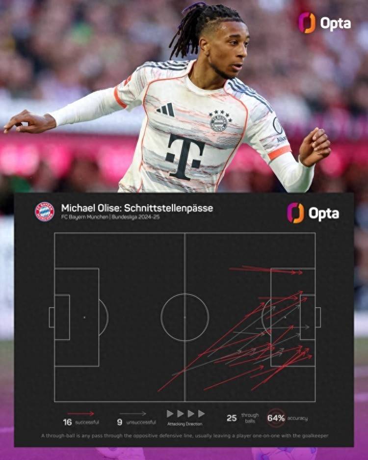 据数据统计,奥利塞上赛季在德甲联赛中共计25次尝试直塞,其中16次成功直塞排名德甲同期最多,成功率高达64%。拜仁新赛季在穆西亚拉缺席的情况下,需要奥利塞的创造力。