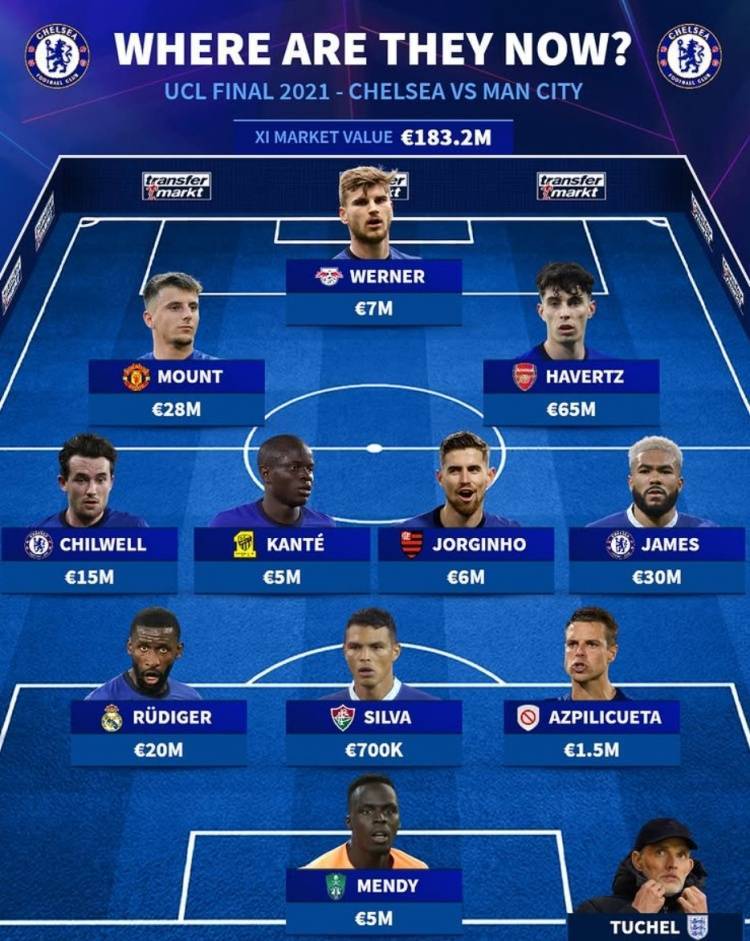 德转列切尔西2021欧冠决赛首发:当前总身价1.832亿欧元